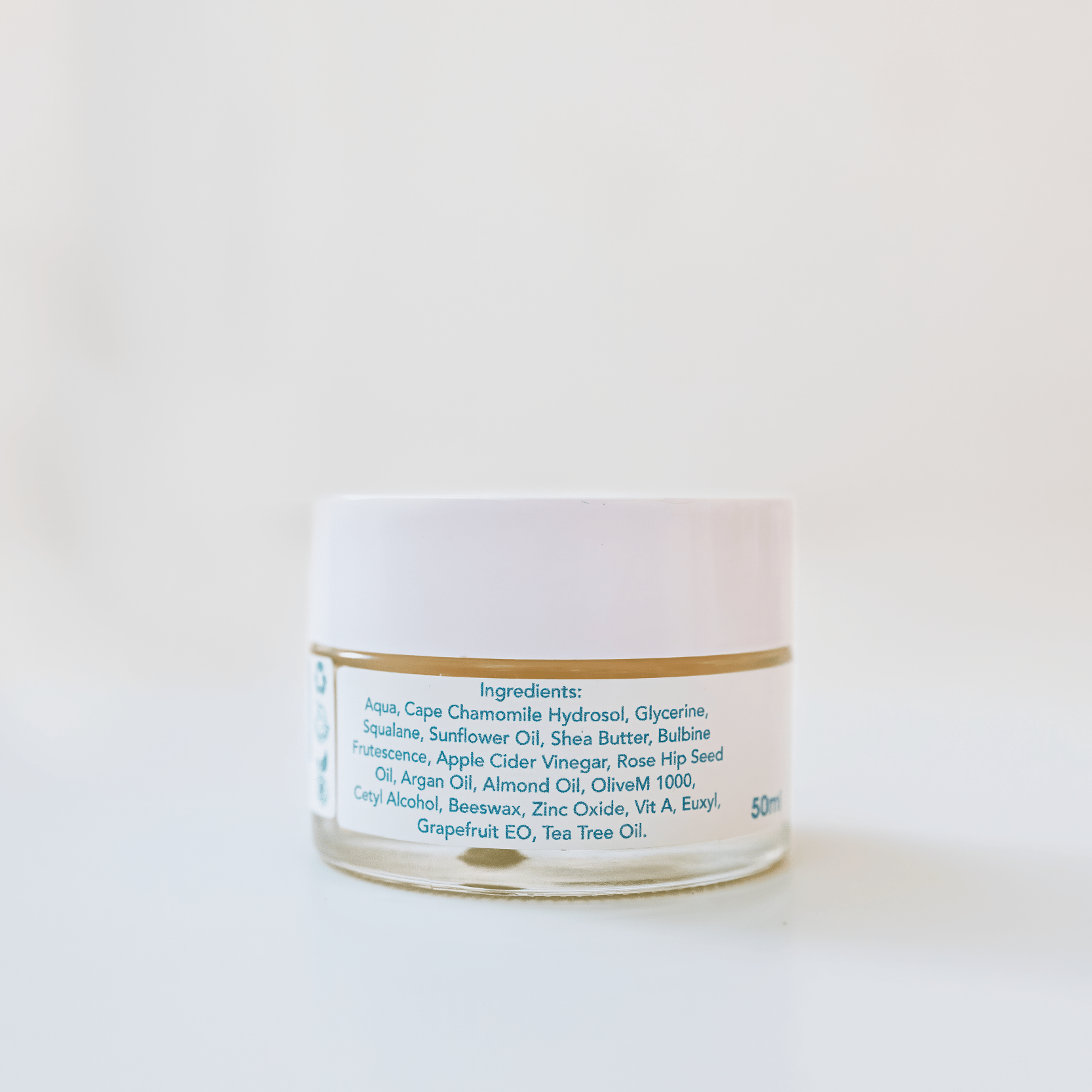 Cape Chamomile Hydrosol, Distilled Water, Rose Hip Seed Oil, Argan Oil, OliveM 1000, Almond Oil, Shea Butter, Cetyl Alcohol, Glycerine, Zinc Oxide, Sunflower Oil, Squalane, Beeswax, EUXYL K903, Grapefruit Essential Oil, Vitamin A, Bulbine Frutescence Extract, Apple Cider Vinegar & Tea Tree Oil.