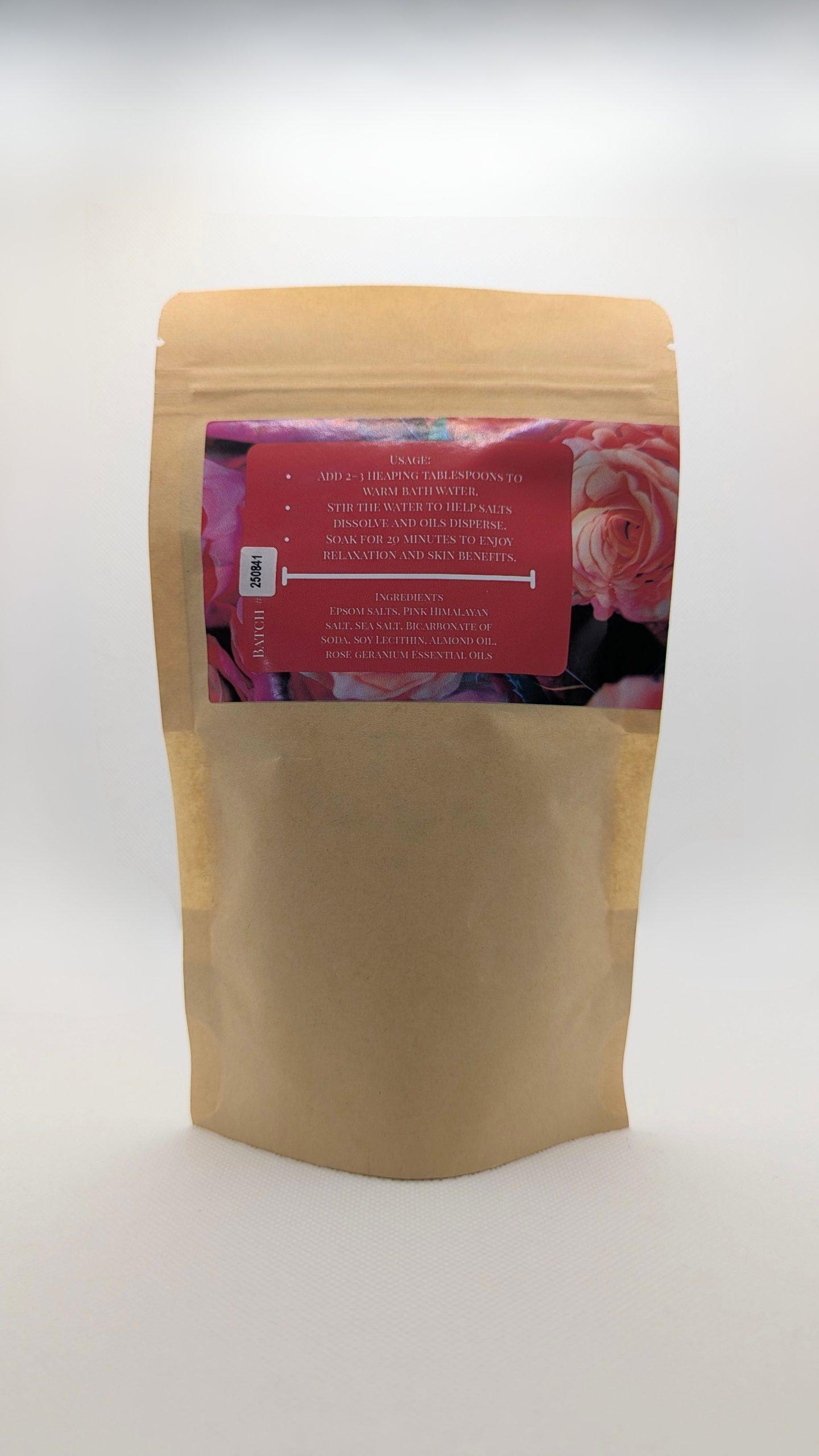 Epsom Salts, Sea Salt, Desert Salt, Tapioca Starch, Sweet Almond Oil, Soy Lecithin, Lavender/Rose Geranium/Lemongrass Essential Oils, Dried Blossoms.
